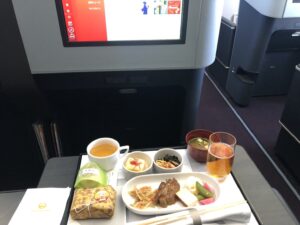 うちのスタッフがステイタス特権を利用して優先ランクアップした国内線ファーストクラスのシートとサービスがこちら!1、2時間のフライトには十分すぎますね。