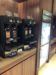 JMB会員しか入れない桜ラウンジの画像です。写真撮ってると恥ずかしいようで誰もいないと隙に隠れて取っている感じが伝わってきます。コーヒーやソフトドリンクに加え生ビールもタダで飲めるしカレーやサンドイッチなどもタダ食べれるそうです。以前に高橋真麻さんがテレビでラーメンとかお寿司とか食べてたけど、あれは国際線の方かな?